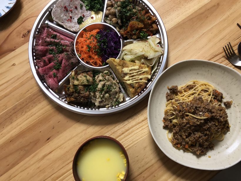 晩御飯は前日に仕込んでおいたミートソースパスタと家の近くの「ライクアウトストア」さんのオードブル、ケーキ。