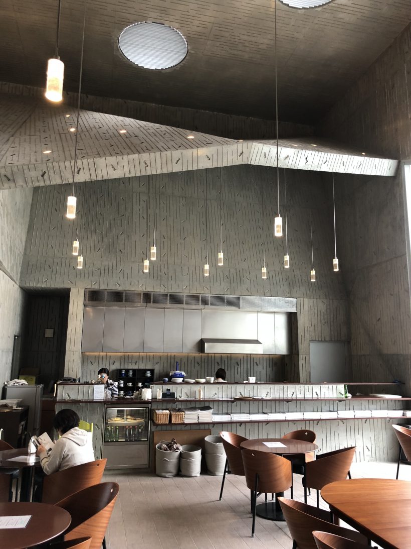 コンクリートが打ちっぱなしで、天井が高くて開放感がある空間。