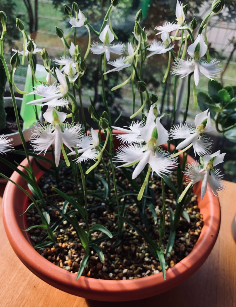 細い茎の先に咲いている、真っ白な花はとても美しいです。