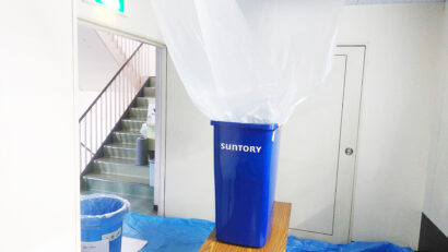 その影響か、この上下(1階と3階の踊り場)もびちょびちょになっていたらしく、ビニールシートで覆われていました。