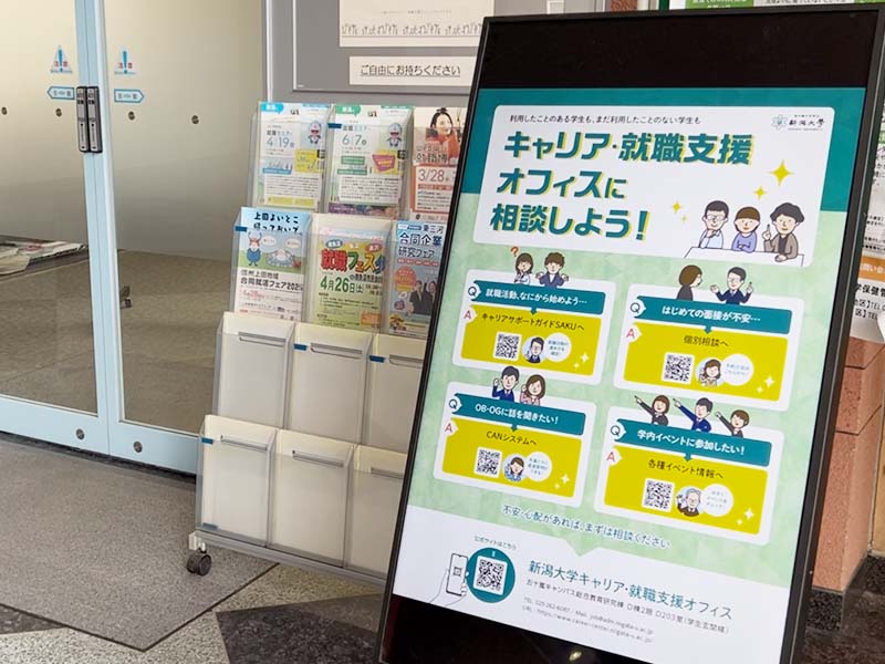 学生にもっと気軽にキャリアセンターを利用してもらえるよう、案内チラシを動画化し、キャリアセンター前のサイネージで活用。